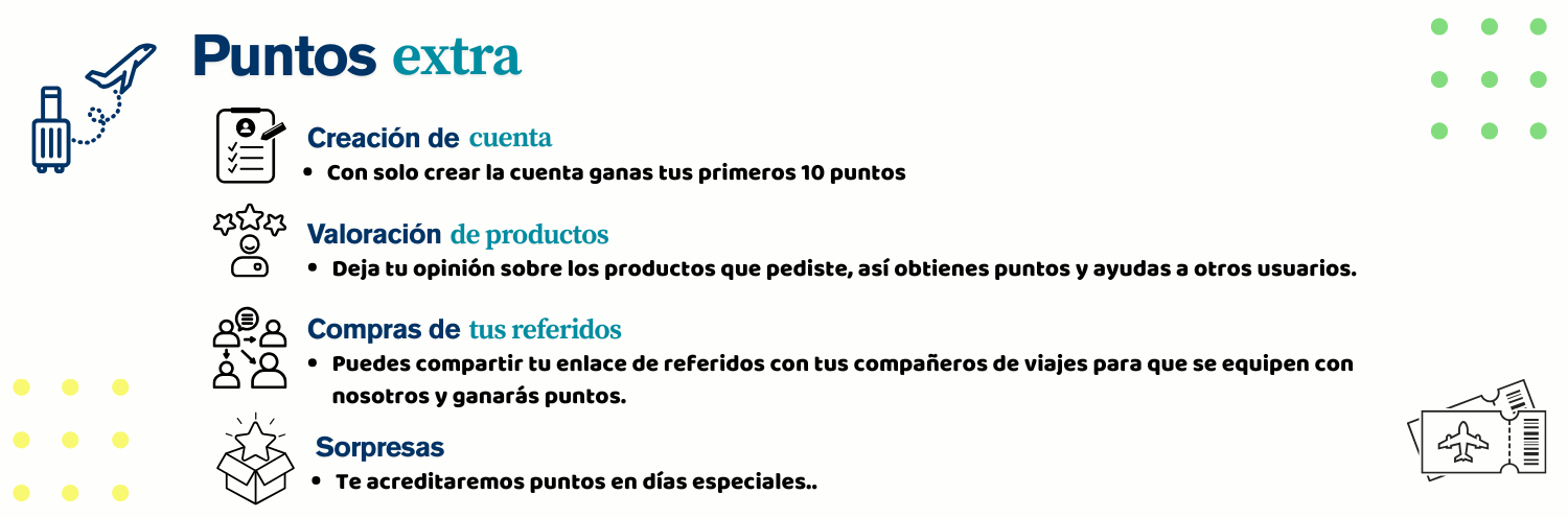 El programa «Soy Viajero Frecuente Club» te permite ganar puntos por cada compra y otras acciones como referir amigos o dejar valoraciones. Luego, puedes canjear tus puntos por descuentos en tus compras.